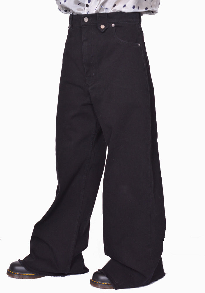 Baggy denim pants in black featuring a zip front with a top button closure, floor length, wide flare legs and 5 pockets styling from Egonlab. 2025SS collection.