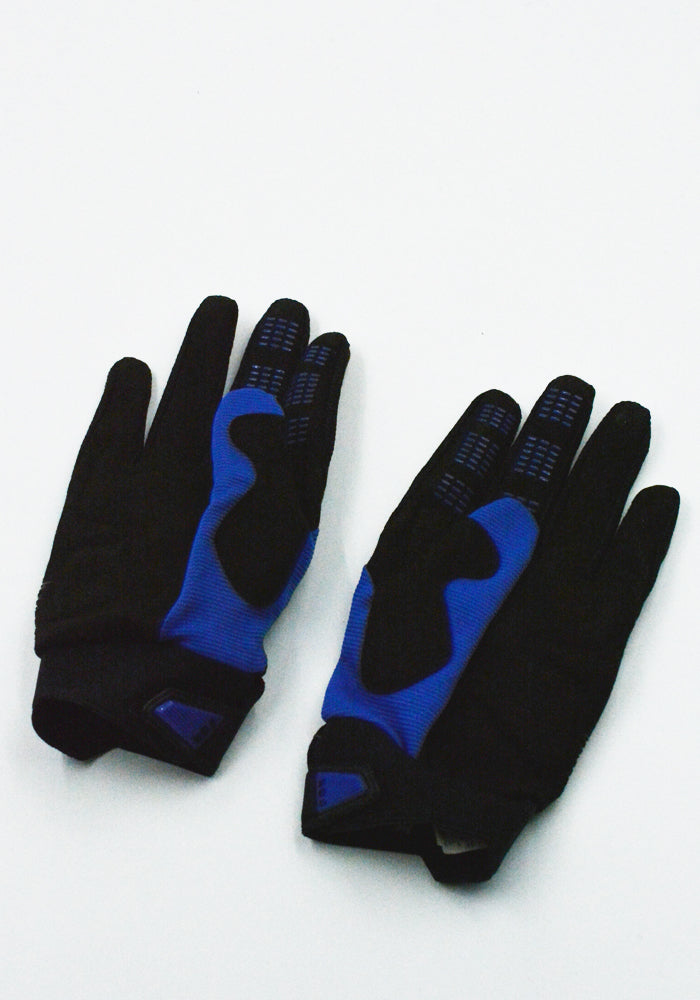 キコ・コスタディノフ 2025年秋冬ウィメンズコレクションより、ブラック/ブラウン/ブルーのモトクロスグローブ一式。フォックスヘッドパッチ付き。