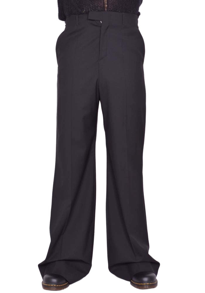 Men's tailored pants in light weight black virgin wool features a zip front with a top hook closure, straight legs and center crease from MATIERES FECALES collection.