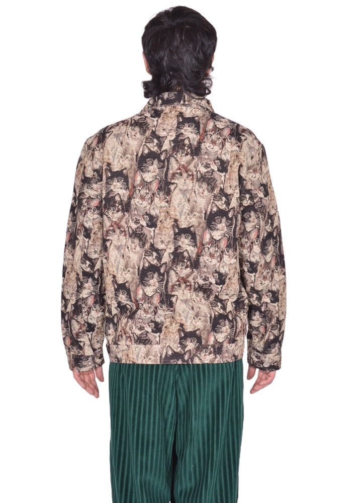 Unisex trucker jacket in cats pattern gobelin weaving features a wide collar, a  button front closure and long sleeves with buttoned cuffs  from BLESS N°80 "Reflexic" collection.