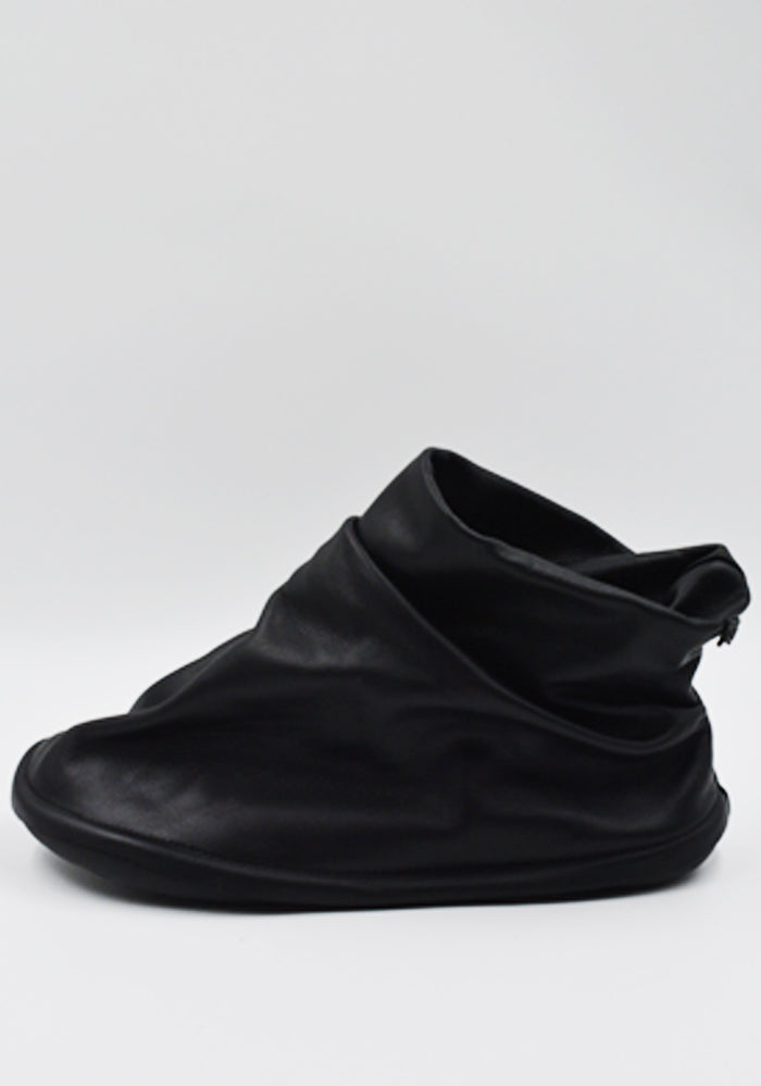 Men's draped ankle boots in black calfskin  with EVA footbeds and TPU outsoles (20% recycled) from Camper x Issey Miyake collaborationcollection.