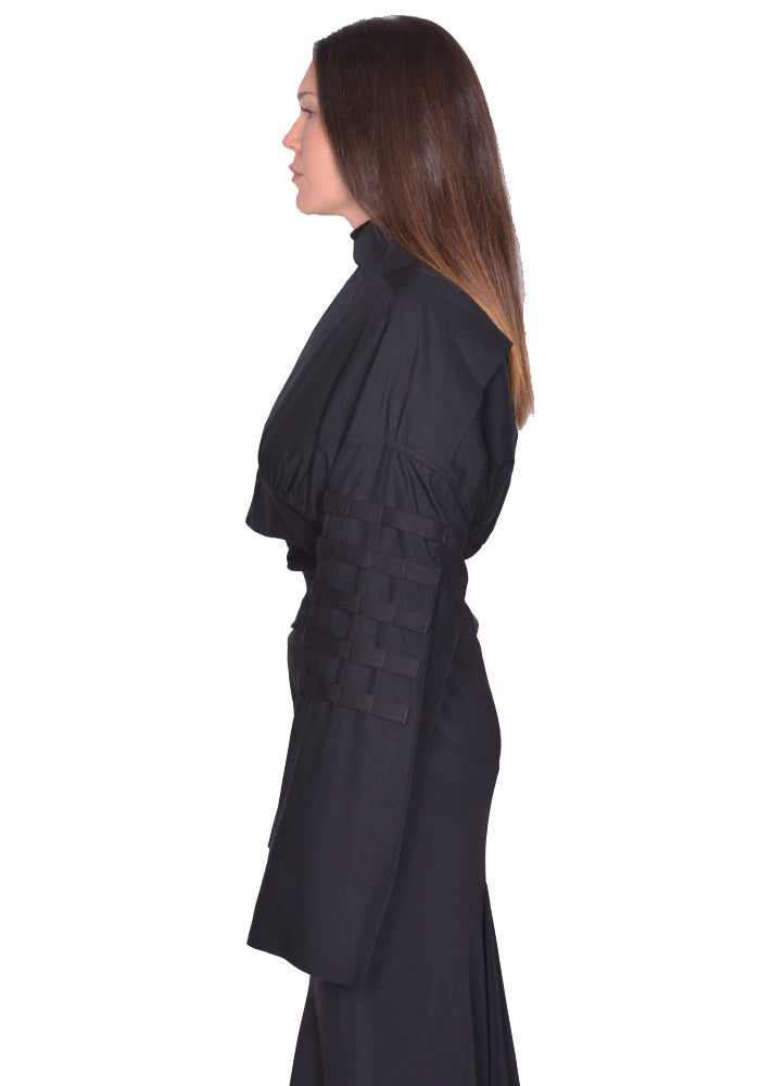 Cropped bomber jacket in black lyocell features funnel neck,  an off centre zip front closure, kimono-like long wide sleeves with webbing straps from Rick Owens 2025SS "Hollywood" Collection.