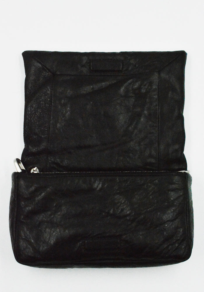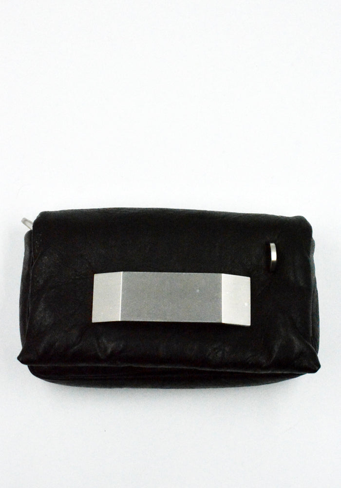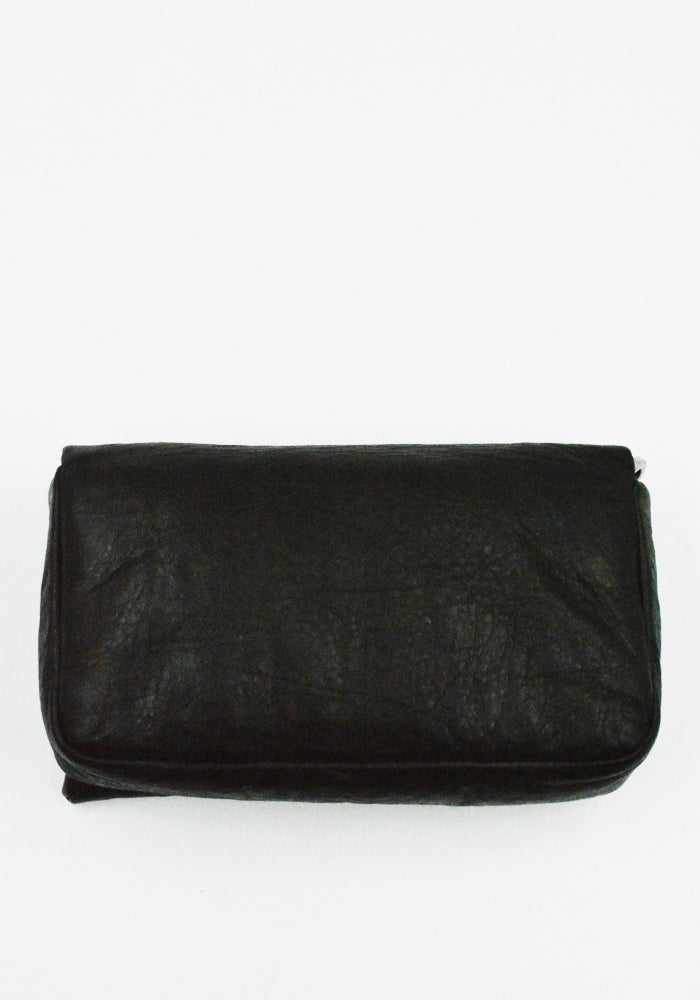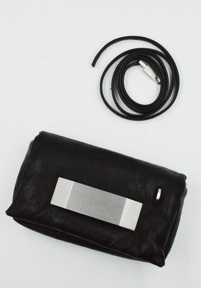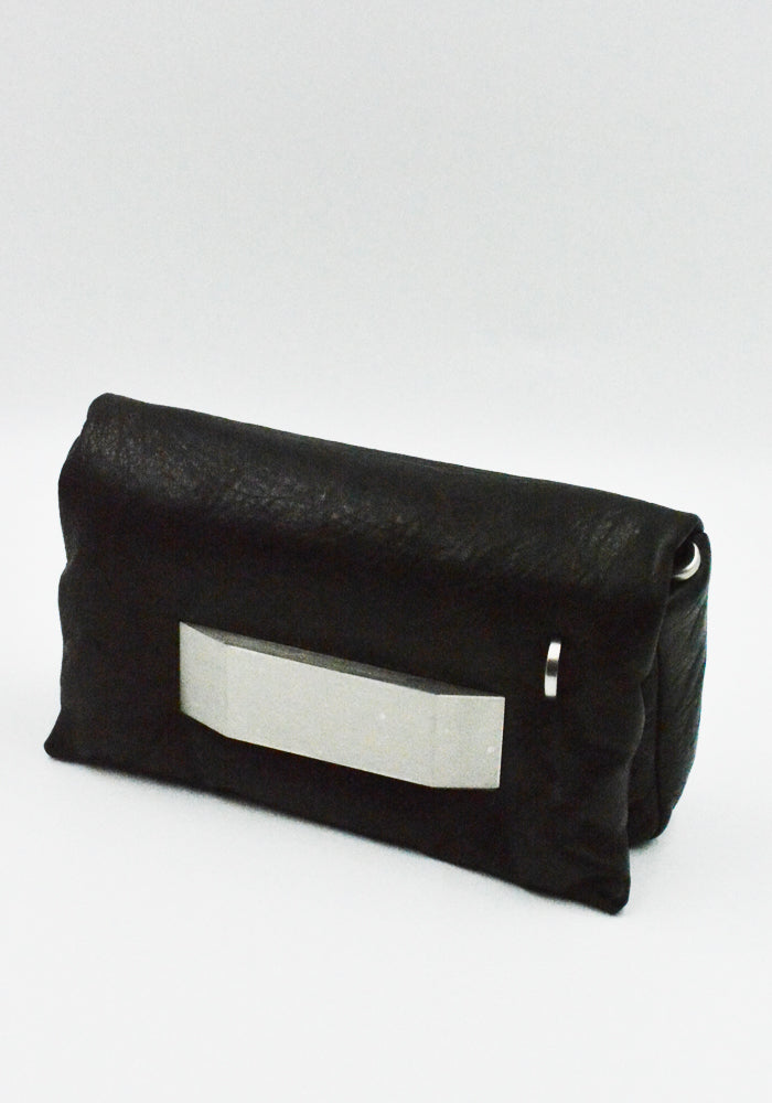 Small rectangular shaped black padded leather bag features a front flap with a palladium indentrd easy-grip bevel, a magnetic closure and detachable shoulder strap from Rick Owens 2026ss "Temple" Collection.