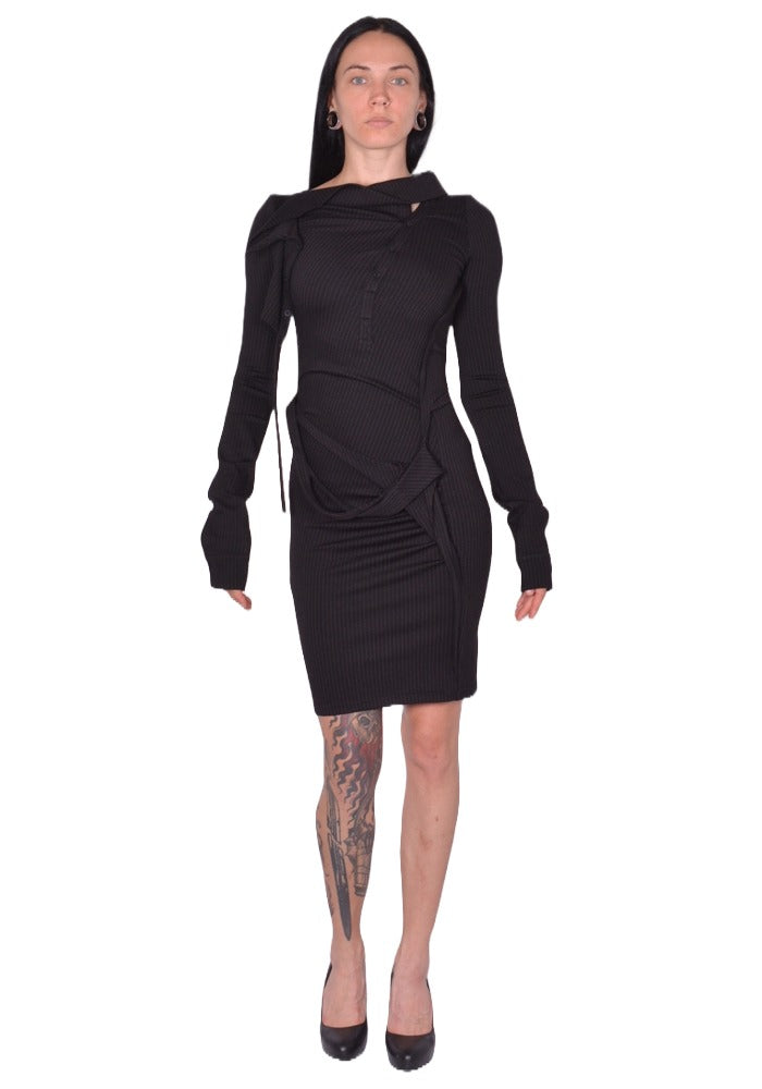 Asymmetric mini dress in black pin stripe jersey features an asymmetric collar, Off-center four buttons placket, long sleeves with buttoned cuffs and multi straps detail from Ottolinger 2025FW collection.