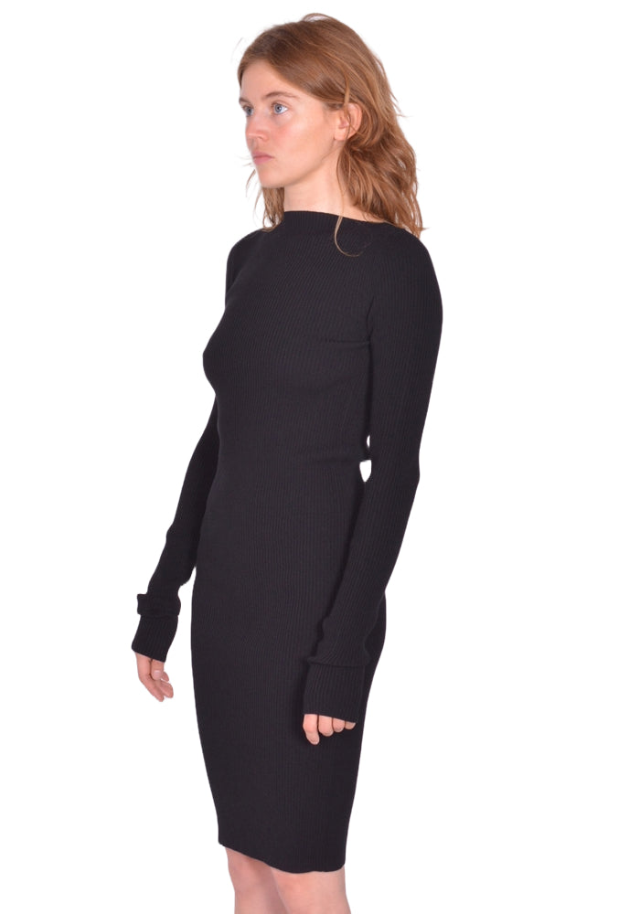 Knit dress in black ribbed viscose blend features a boat neck, long sleeves and an open back detail from Rick Owens 2026SS "concordians" Collection.