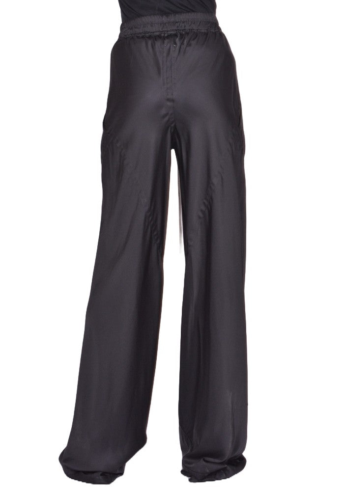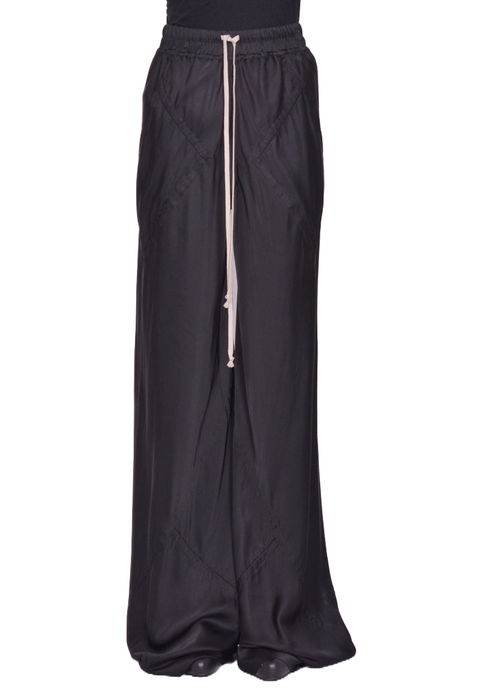 High wasted pants in black acetate/silk blend jersey featuring an elastric waist band, bias cut detailing, floor length and raw edge hem line from Rick Owens 2025FW "concordians" Collection.