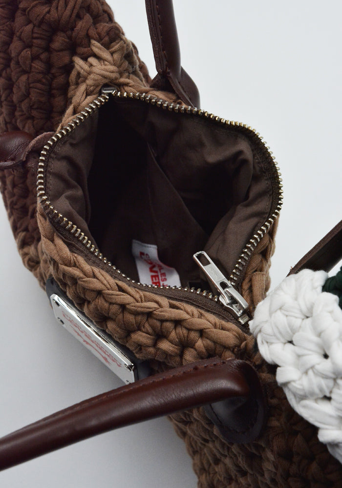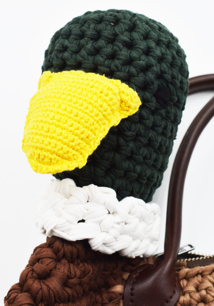 チャールズ・ジェフリー・ラヴァーボーイ 2025年春夏コレクションより、綿編みのアヒル型ハンドバッグ。ダブルレザーハンドル、トップジップ開閉、綿裏地、前面にブランドロゴタグ付き。