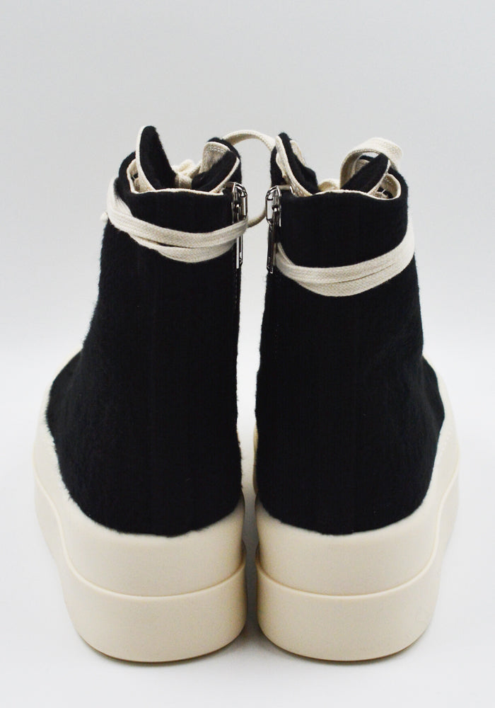 足首より高い位置まである、ブラックの起毛コットン製メガバンパースニーカー。8つのアイレットにホワイトのシューレース、ホワイトラバー製のラウンドトゥ、リック・オウエンス Drkshdw 2025FW コレクションのホワイトシャークトゥースラバーソールを採用。