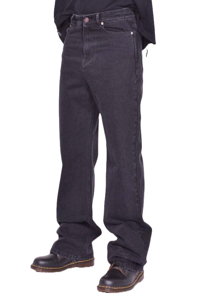 Unisex, Denim jeans in washed black cotton features a zip front with a top button closure, mid-rise and wide legs from MATIERES FECALES 2026SS collection.