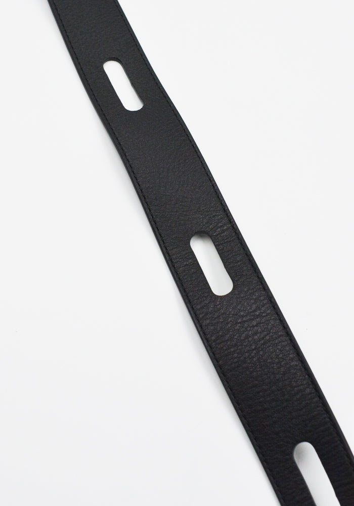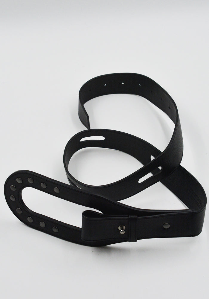 キコ・コスタディノフ 2025年春夏メンズコレクションより、ブラックナッパカーフレザー製のオルヴォスベルト。大きな楕円形の開口部と季節限定のリベット金具が特徴です。