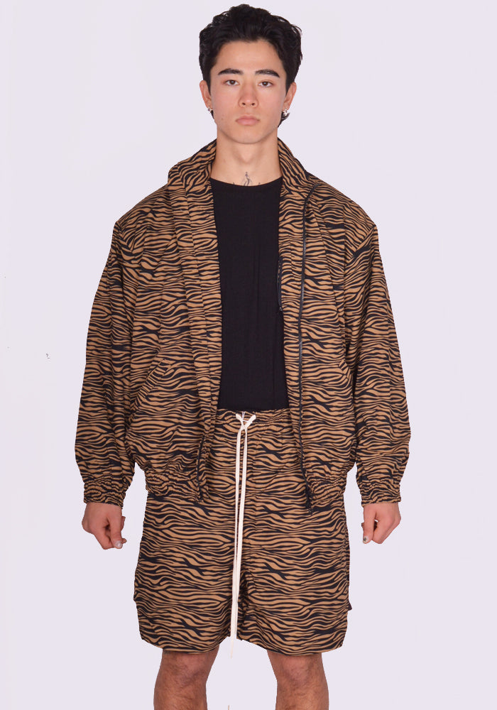 Yuiki Shimojiコレクションよりタイガープリントのユニセックス・ジップジャケット。スタンドカラー、フロントはフルジップ開閉式。