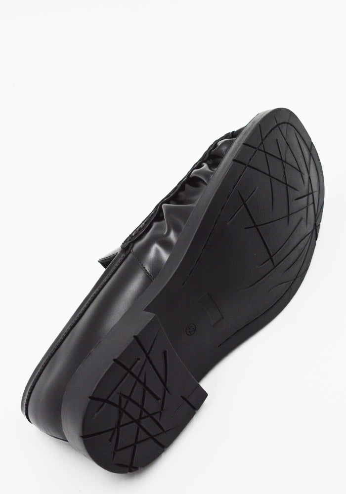 黒のカーフスキンアッパーを採用したレザーローファーは、ラウンドトゥとルシュドディテールが特徴で、レザーライニング、リサイクル素材のOrthoLite®フットベッド、Camperlab FW25コレクションのラバーアウトソールを装備しています。