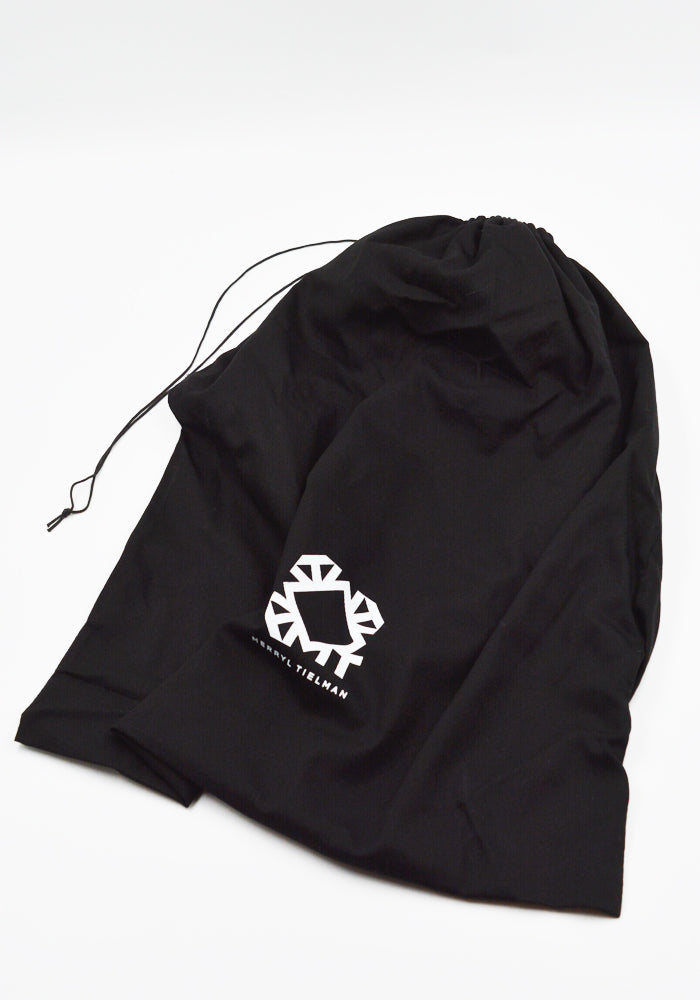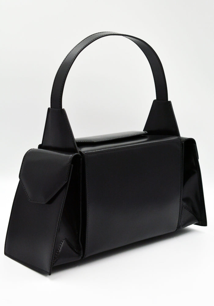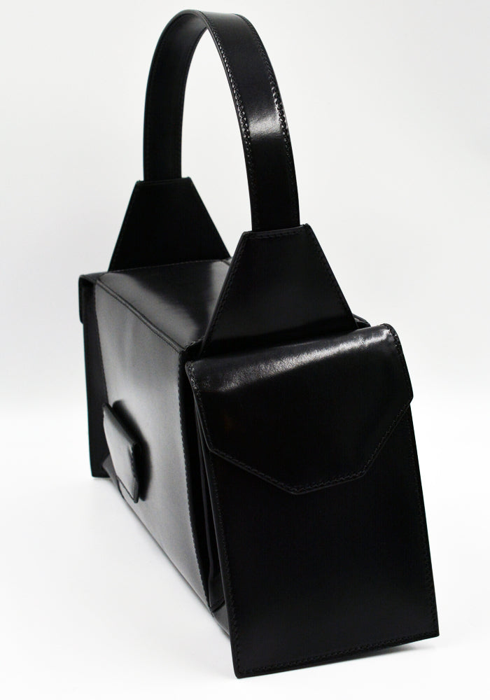 Merryl Tielmanコレクションよりブラックのシャイニーカウレザーを使用したエレガントなボックス型ハンドバッグ。 フロントにさりげなく隠れた2つのクレジットカード入れ付き。ストラップの長さを調節すれば、ハンドバッグからショルダーバッグに。 コットンの巾着袋付き。