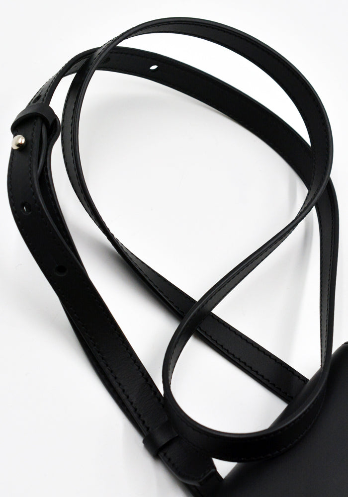 Merryl Tielmanコレクションのマットブラックの牛革を使用した、細部にまでこだわったフォンポーチ。