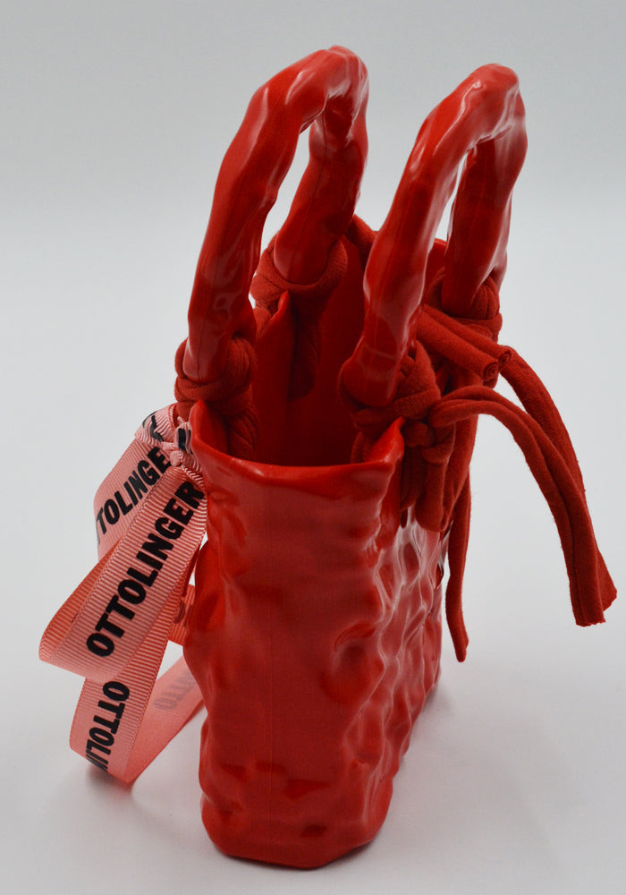 オットリンガー2025年秋冬コレクションの小型トートバッグ。赤色の手作り再生ゴム製。オープントップ、ダブルトップハンドル、赤いリボン、ハンドル部分にロゴプリント入りピンクのリボン付き。