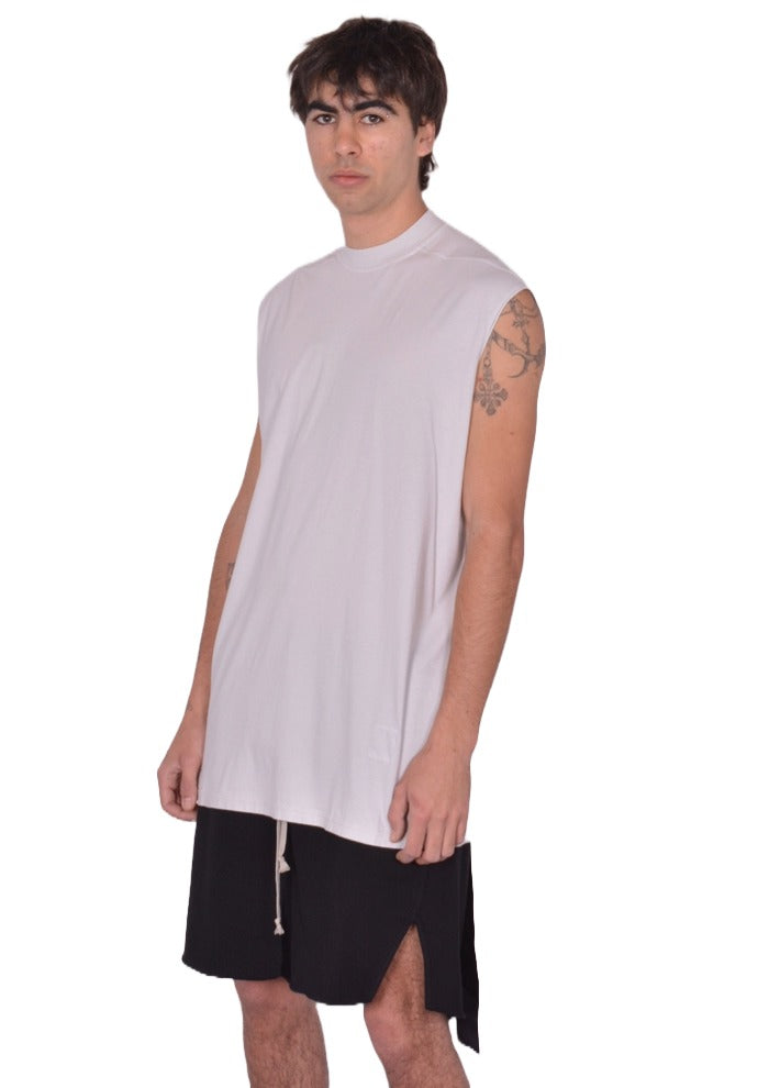 リック・オウエンス ダークシャドウ 2026年春夏コレクションより、ウォッシュドミルクカラーのコットンジャージー素材を使用したメンズノースリーブTシャツ。クルーネック、ヒップ下丈、ワイドショルダーに水平ショルダーシーム、中央背縫い仕様。