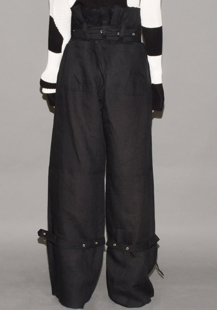 High-waisted wide cargo pants in black linen featuring a elastic waist band with wide buckle belt closure and thin buckle belts on the lower legs from MARQUES ALMEIDA 2018 Spring & Summer collection.