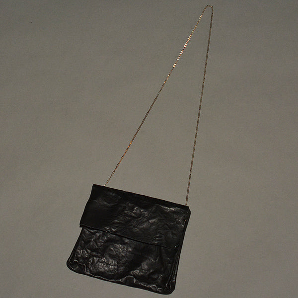 Flapped shoulder bag in black crinkled leather featuring a front cover flap, accordion side pleats detail and a silver chain shoulder strap from m.a.+ Maurizio Amadei collection.