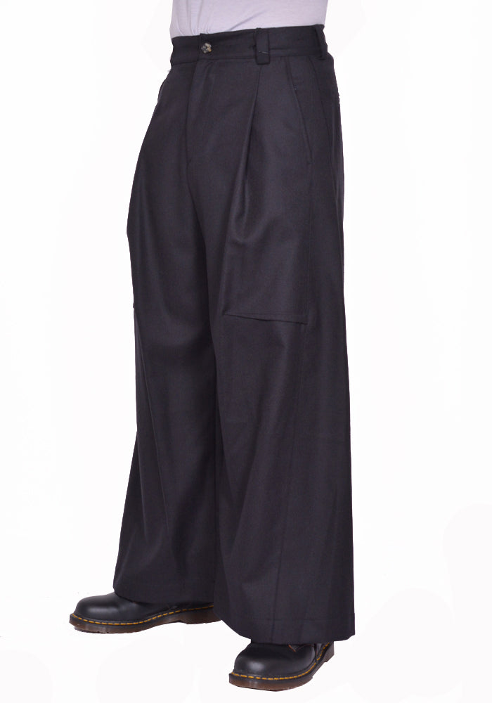マリーナ・イー 2025年秋冬コレクションより、ブラックウール製ニーダーツパンツ。ウエストバンド付き、フロントジッパーとトップボタン留め仕様。ワイドレッグで膝部分に水平ダーツを施したデザイン。