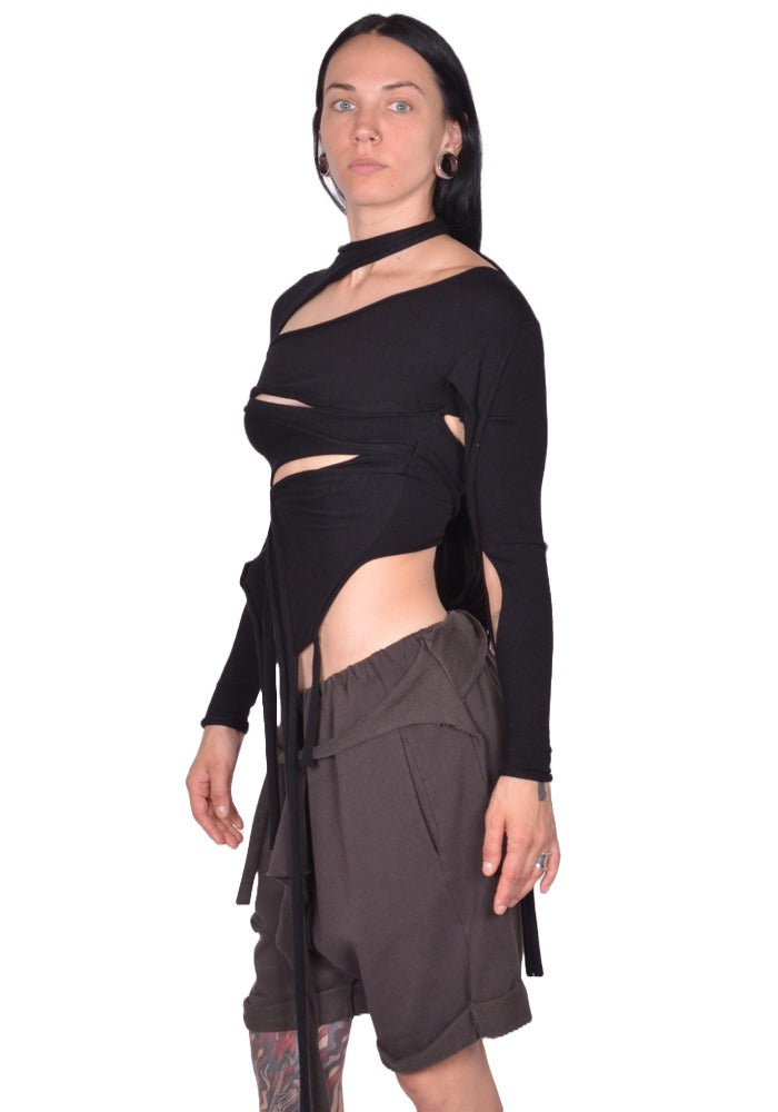 オットリンガー 2025年秋冬コレクションのブラックビスコース混紡アシンメトリーニットトップ。モックネック、長袖、カットアウトディテール、マルチストラップ仕様。