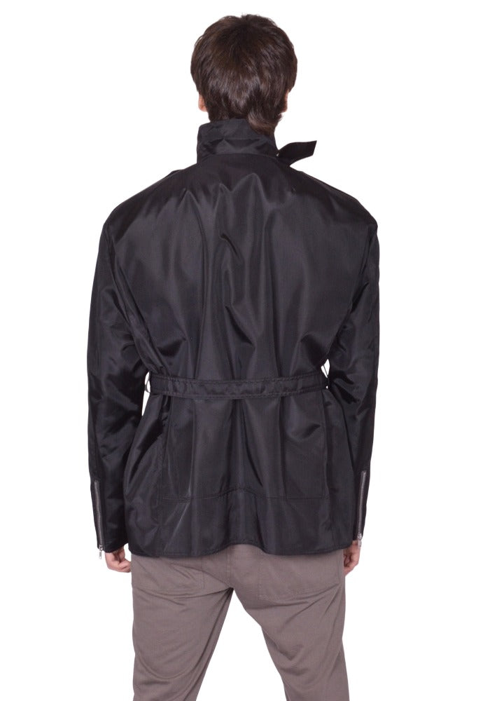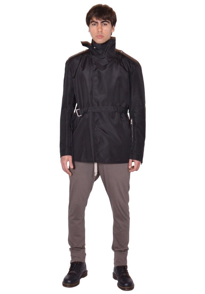Mens nylon  jacket in black features an off-center snap button front with a high collar with strap closure, and backled waist belt from Rick Owens 2026ss "Temple" Collection.